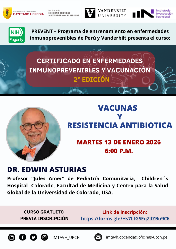 El Instituto de Medicina Tropical Alexander von Humboldt (IMTAVH) de la Universidad Peruana Cayetano Heredia como parte del Programa de entrenamiento en enfermedades inmunoprevenibles de Perú y Vanderbilt (PREVENT) tiene el agrado de invitarle al Curso “CERTIFICADO EN ENFERMEDADES INMUNOPREVENIBLES Y VACUNACIÓN 2025 (2° Edición)”.