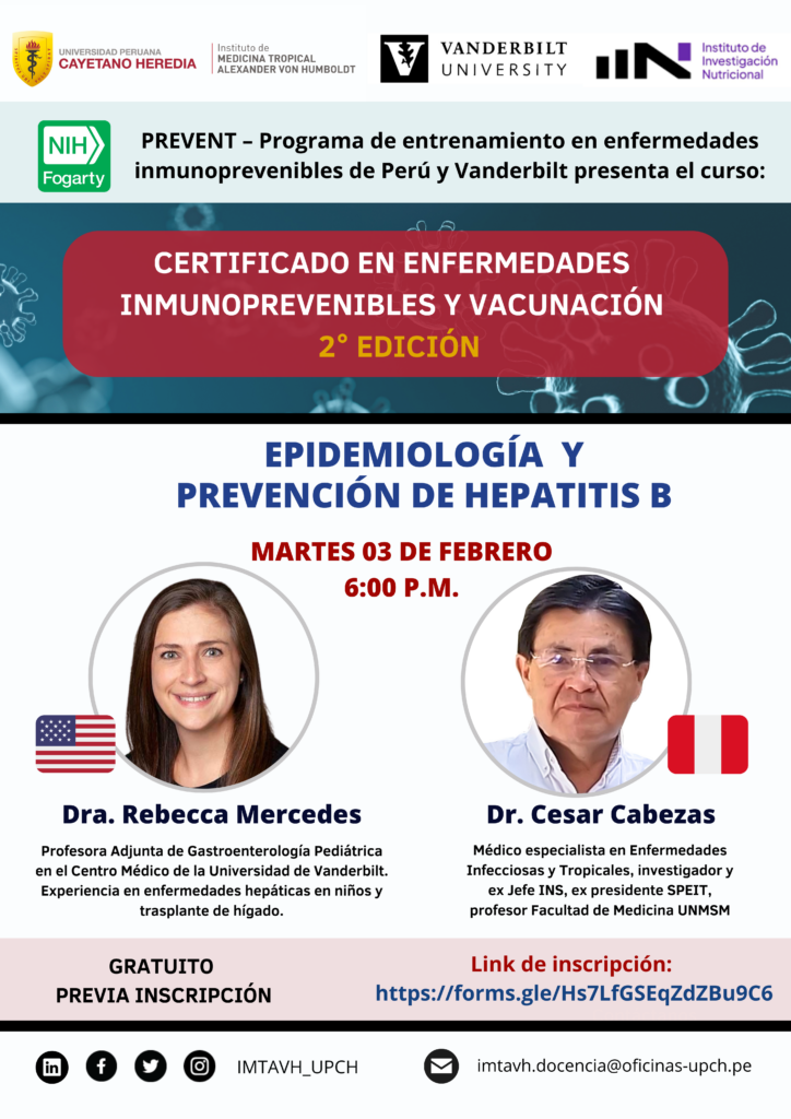 El Instituto de Medicina Tropical Alexander von Humboldt (IMTAVH) de la Universidad Peruana Cayetano Heredia como parte del Programa de entrenamiento en enfermedades inmunoprevenibles de Perú y Vanderbilt (PREVENT) tiene el agrado de invitarle al Curso “CERTIFICADO EN ENFERMEDADES INMUNOPREVENIBLES Y VACUNACIÓN (2° Edición)”.