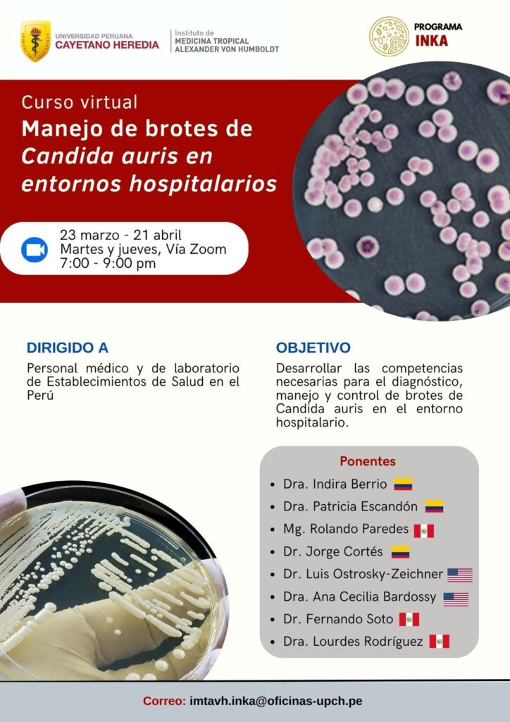 El curso “Manejo de brotes de Candida auris en entornos hospitalarios”, organizado por el Instituto de Medicina Tropical Alexander von Humboldt (IMTAvH), tiene como objetivo desarrollar competencias para el diagnóstico, manejo y control de brotes de Candida auris en establecimientos de salud del Perú.